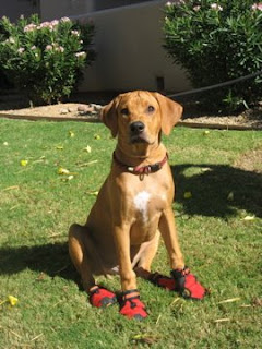 Cairo is 20 weeks old today!! He had to get larger boots, now in red :^) ..lol..